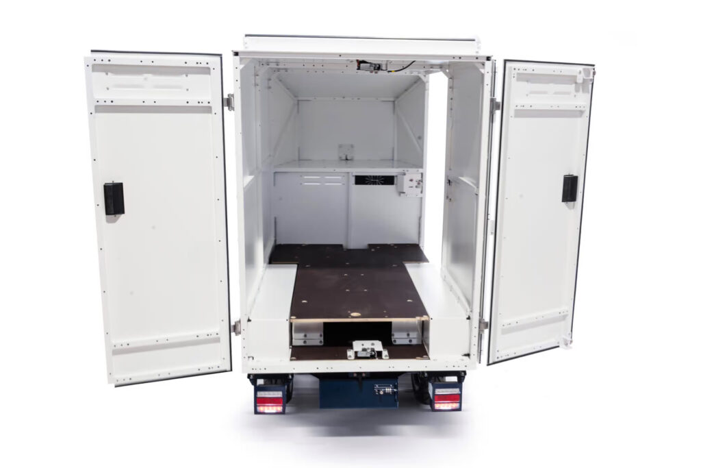 Remorque fermée permettant de transporter et sécuriser des marchandises pendant les tournées urbaines. Elle est particulièrement adaptée aux activités de livraison et de distribution en centre-ville.